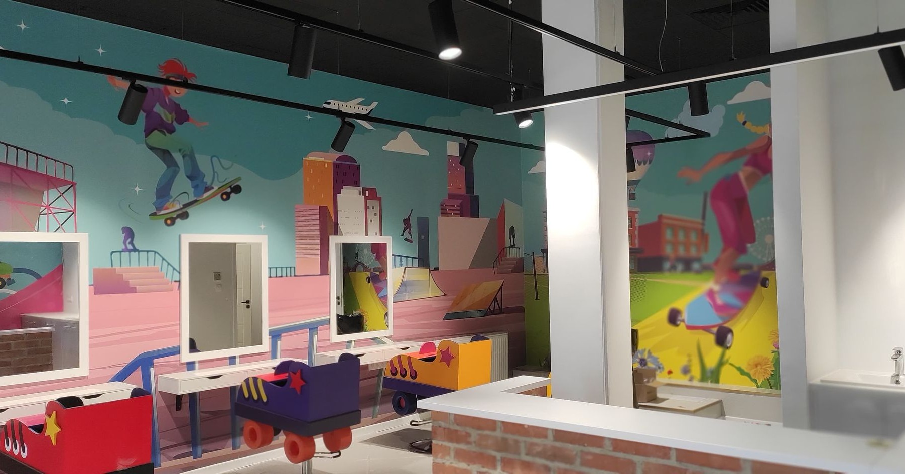 Kolorowy projekt wnętrz dla sieci salonów fryzjerskich dla dzieci- Colorful interior design for children's hair salon chain